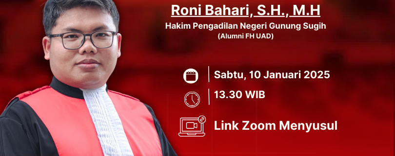 Kuliah dosen tamu ini menghadirkan Roni Bahari, S.H., M.H., Hakim Pengadilan Negeri Gunung Sugih, yang juga merupakan alumni Fakultas Hukum UAD, sebagai narasumber. Kehadiran praktisi peradilan ini diharapkan dapat memberikan wawasan komprehensif kepada mahasiswa mengenai penerapan nilai-nilai etika dan profesionalisme hakim dalam praktik peradilan di Indonesia.