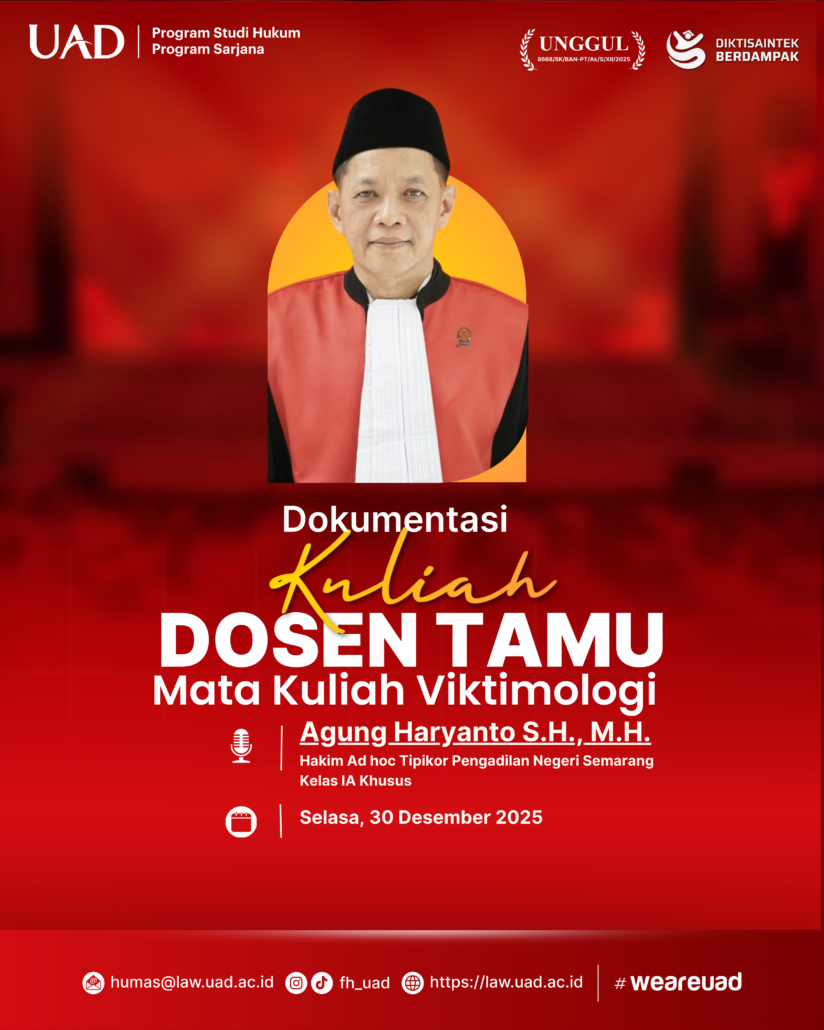 Yogyakarta – Program Studi Hukum Program Sarjana Universitas Ahmad Dahlan (UAD) menyelenggarakan kegiatan Kuliah Dosen Tamu pada mata kuliah Viktimologi, Selasa (30/12/2025). Kegiatan ini menghadirkan Agung Haryanto, S.H., M.H., Hakim ad hoc Tindak Pidana Korupsi (Tipikor) Pengadilan Negeri Semarang Kelas IA Khusus, sebagai narasumber.
